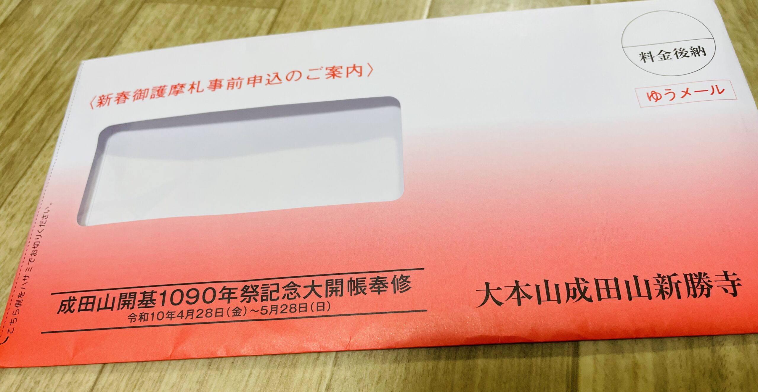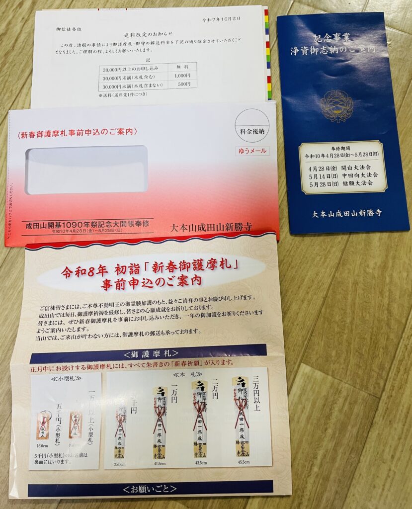 成田山から封書で来年のお札やお守りの